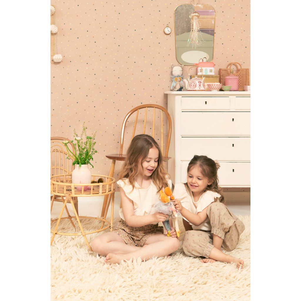 Krásná tapeta malými puntíky (největší má 1 cm) na starorůžovém podkladu působí velmi jemně a nenápadně, takže se snadno kombinuje s ostatními barvami v interiéru.